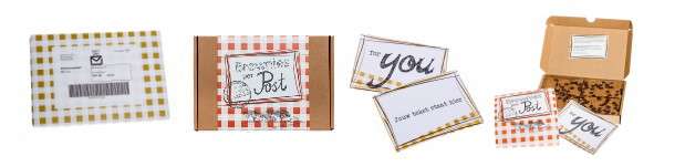 Als het geblokte verzendpapier verwijderd wordt, ziet de ontvanger aan de wikkel dat er brownies in de doos zitten en krijgt hij of zij misschien al een idee van het waarom. Dat is de tweede verrassing. Je kunt in de webshop een keuze maken uit de volgende wikkels: